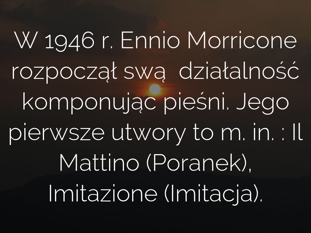 W 1946 r. Ennio Morricone rozpoczął swą działalność komponując pieśni. Jego pierwsze utwory to m. in. : Il Mattino (Poranek), Imitazione (Imitacja).