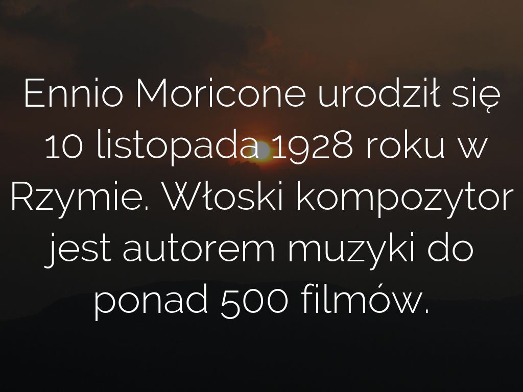 Ennio Moricone urodził się 10 listopada 1928 roku w Rzymie. Włoski kompozytor jest autorem muzyki do ponad 500 filmów.
