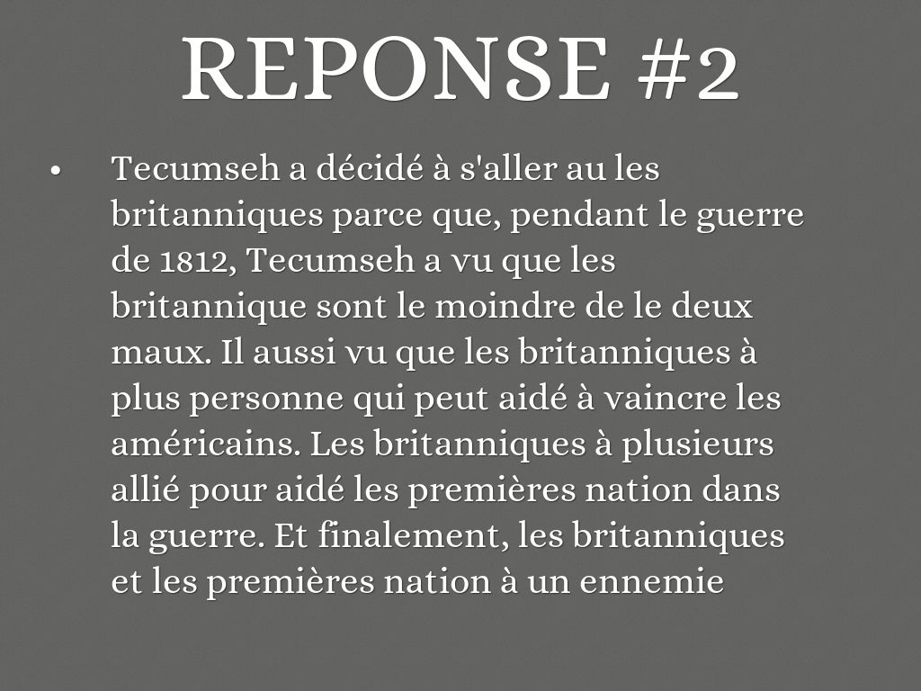 Tecumseh a décidé à s'aller au les britanniques parce que, pendant le guerre de 1812, Tecumseh a vu que les britannique sont le moindre de le deux maux. Il aussi vu que les britanniques à plus personne qui peut aidé à vaincre les américains. Les britanniques à plusieurs allié pour aidé les premières nation dans la guerre. Et finalement, les britanniques et les premières nation à un ennemie commun.
