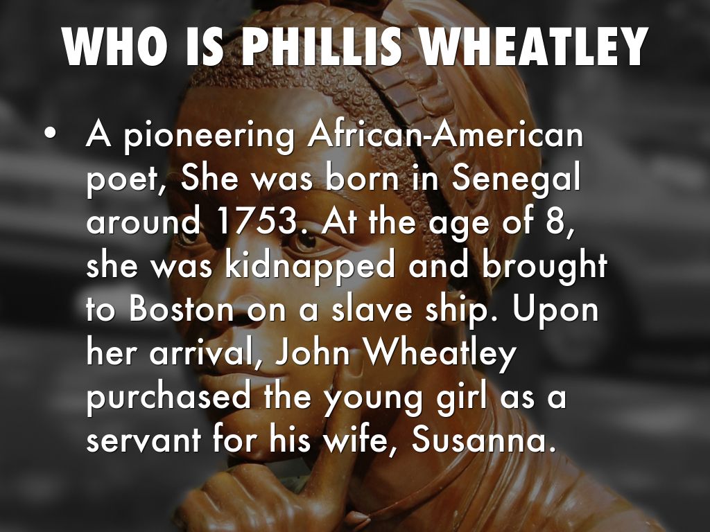 • A pioneering African-American poet, She was born in Senegal around 1753. At the age of 8, she was kidnapped and brought to Boston on a slave ship. Upon her arrival, John Wheatley purchased the young girl as a servant for his wife, Susanna.