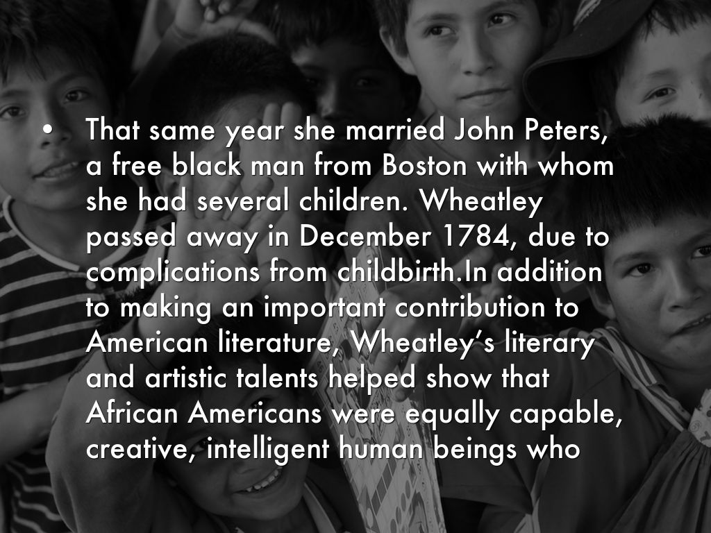 • That same year she married John Peters, a free black man from Boston with whom she had several children. Wheatley passed away in December 1784, due to complications from childbirth.In addition to making an important contribution to American literature, Wheatley’s literary and artistic talents helped show that African Americans were equally capable, creative, intelligent human beings who benefited from an education. In part, this helped the cause of the abolition movement.