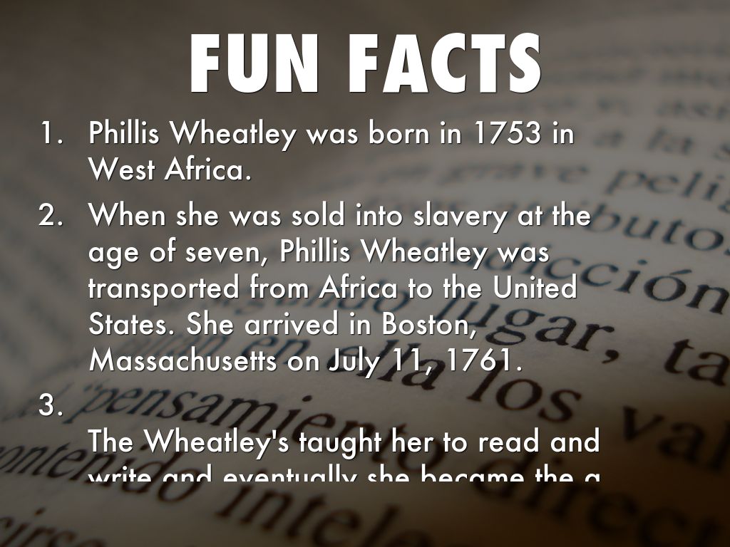 • When she was sold into slavery at the age of seven, Phillis Wheatley was transported from Africa to the United States. She arrived in Boston, Massachusetts on July 11, 1761.