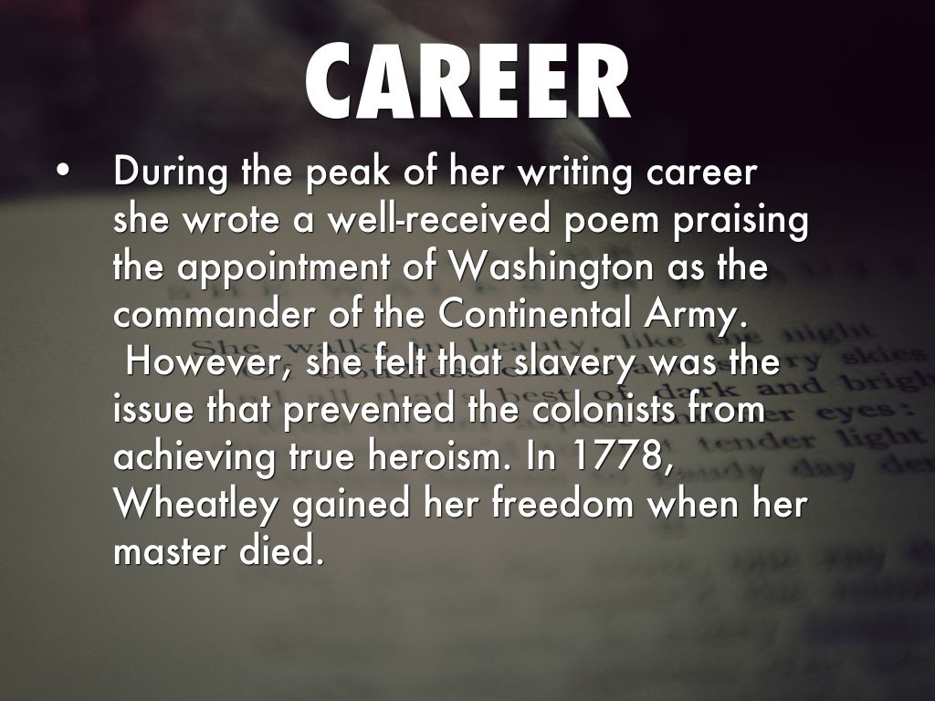 • During the peak of her writing career she wrote a well-received poem praising the appointment of Washington as the commander of the Continental Army. However, she felt that slavery was the issue that prevented the colonists from achieving true heroism. In 1778, Wheatley gained her freedom when her master died.