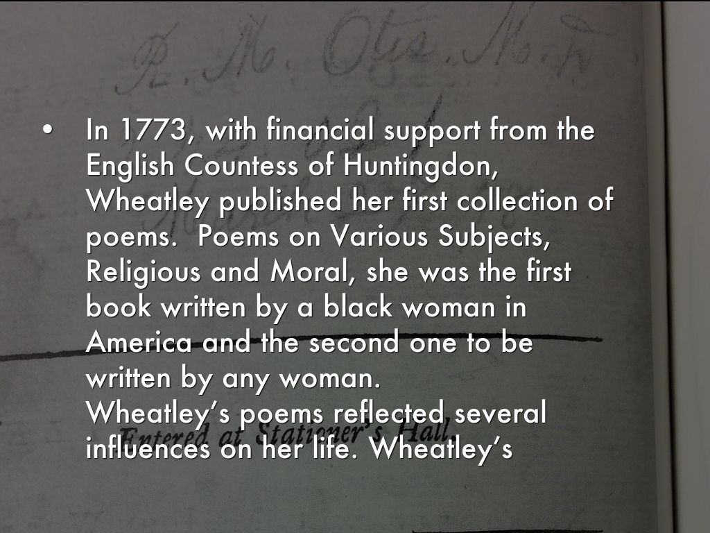 • In 1773, with financial support from the English Countess of Huntingdon, Wheatley published her first collection of poems. Poems on Various Subjects, Religious and Moral, she was the first book written by a black woman in America and the second one to be written by any woman. Wheatley’s poems reflected several influences on her life. Wheatley’s education in Latin influenced her to write in a short epic style. Some of her most popular poems were “To the King’s Most Excellent Majesty” and “To the University of Cambridge in New England”.