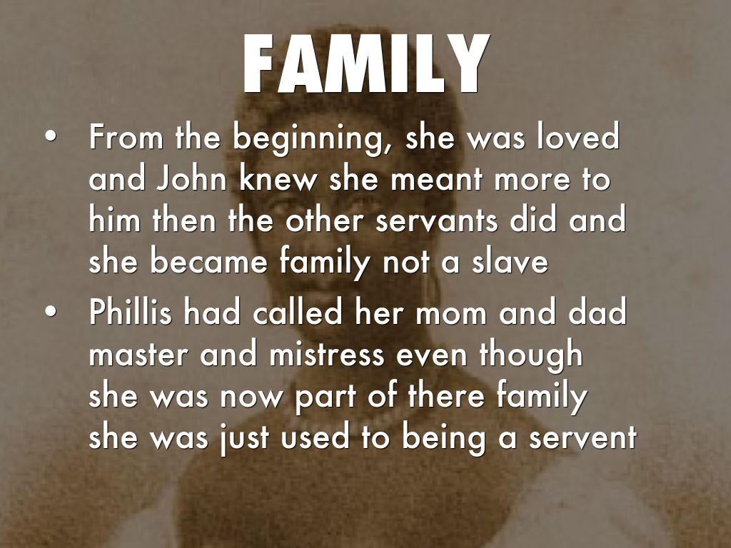 • Phillis had called her mom and dad master and mistress even though she was now part of there family she was just used to being a servent