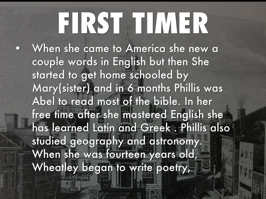 • When she came to America she new a couple words in English but then She started to get home schooled by Mary(sister) and in 6 months Phillis was Abel to read most of the bible. In her free time after she mastered English she has learned Latin and Greek . Phillis also studied geography and astronomy. When she was fourteen years old, Wheatley began to write poetry, publishing “An Elegiac Poem, on the Death of the Celebrated Divine George Whitefield” in 1770, which brought her great notoriety.