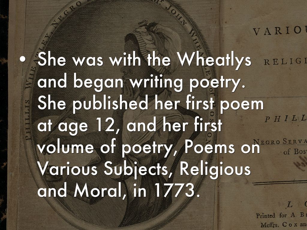 • She was with the Wheatlys and began writing poetry. She published her first poem at age 12, and her first volume of poetry, Poems on Various Subjects, Religious and Moral, in 1773.