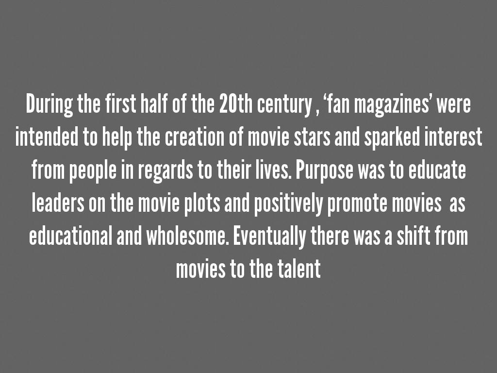 During the first half of the 20th century , ‘fan magazines’ were intended to help the creation of movie stars and sparked interest from people in regards to their lives. Purpose was to educate leaders on the movie plots and positively promote movies as educational and wholesome. Eventually there was a shift from movies to the talent