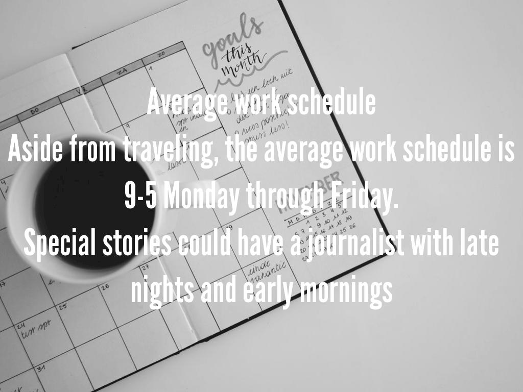 Aside from traveling, the average work schedule is 9-5 Monday through Friday.