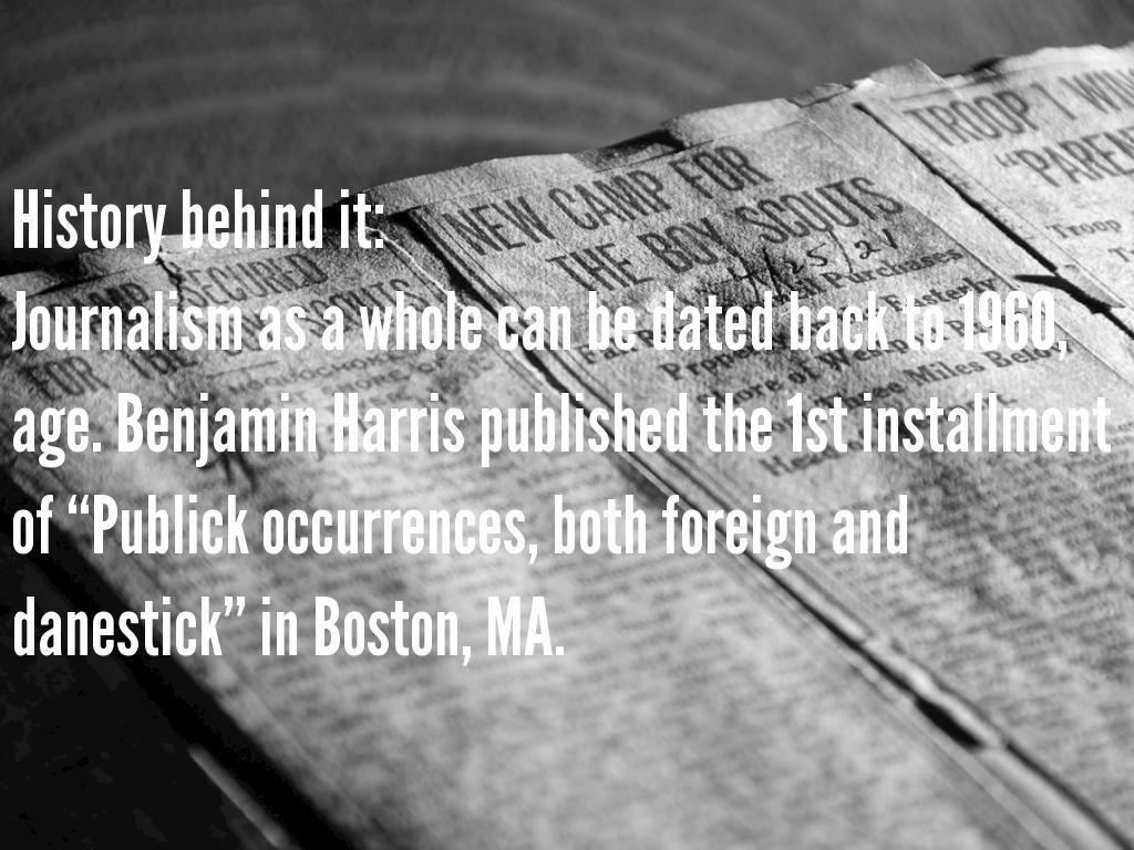 Journalism as a whole can be dated back to 1960, age. Benjamin Harris published the 1st installment of “Publick occurrences, both foreign and danestick” in Boston, MA.