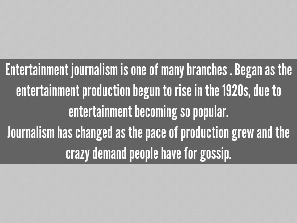Entertainment journalism is one of many branches . Began as the entertainment production begun to rise in the 1920s, due to entertainment becoming so popular.