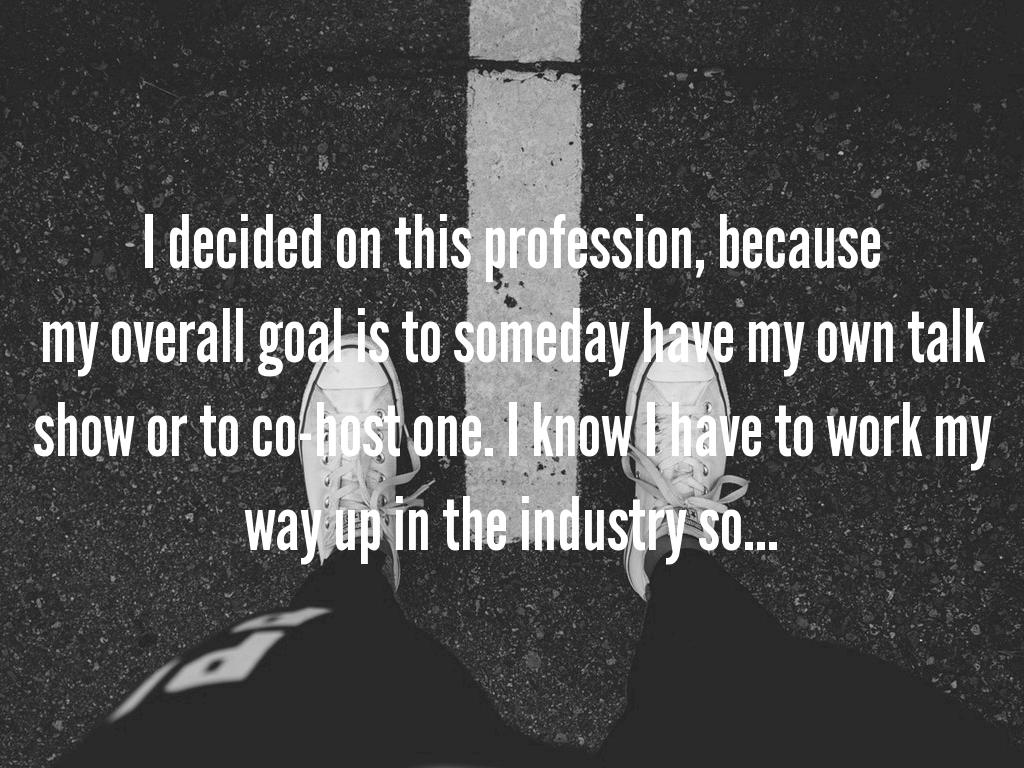 my overall goal is to someday have my own talk show or to co-host one. I know I have to work my way up in the industry so...