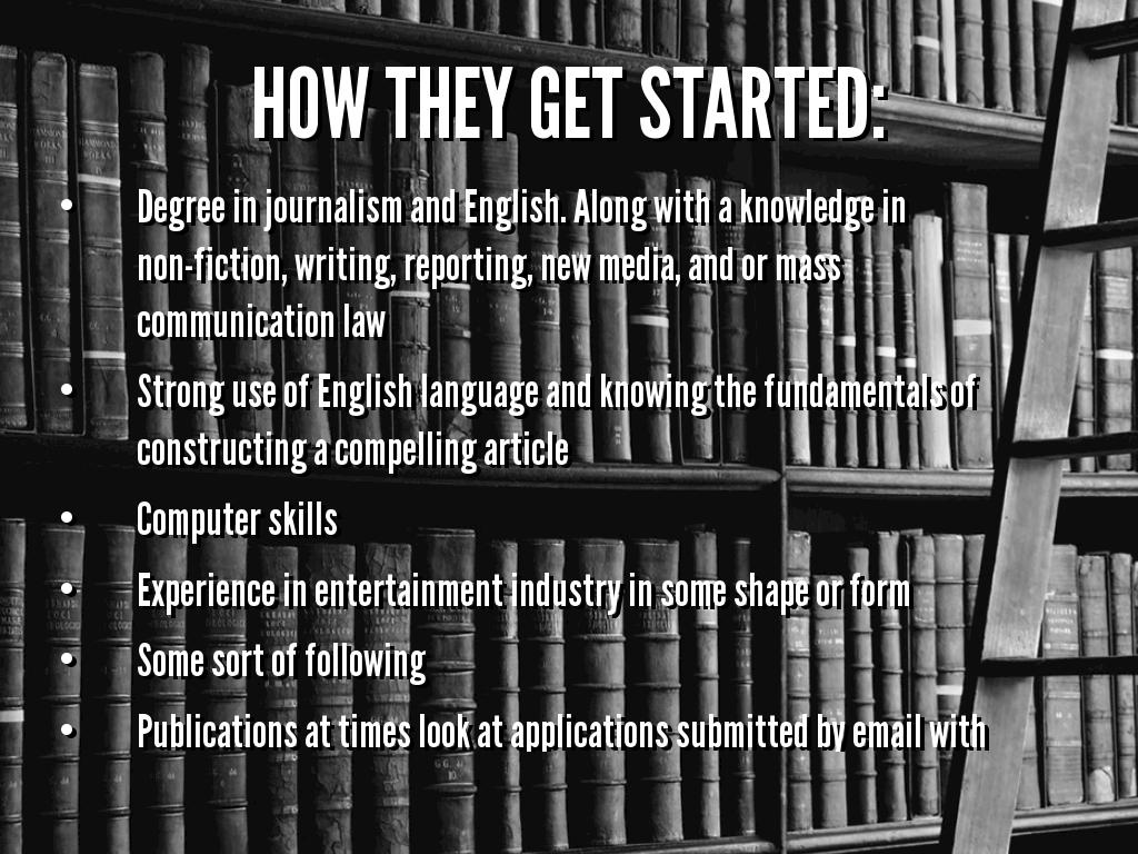 - Degree in journalism and English. Along with a knowledge in non-fiction, writing, reporting, new media, and or mass communication law
