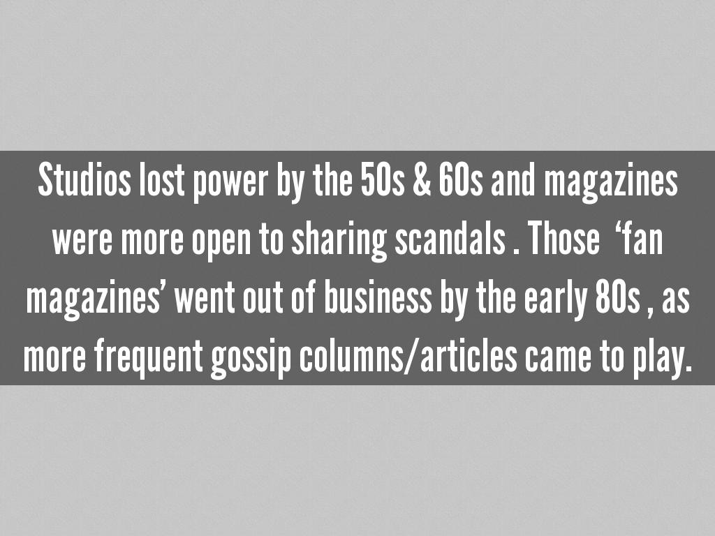 Studios lost power by the 50s & 60s and magazines were more open to sharing scandals . Those ‘fan magazines’ went out of business by the early 80s , as more frequent gossip columns/articles came to play.