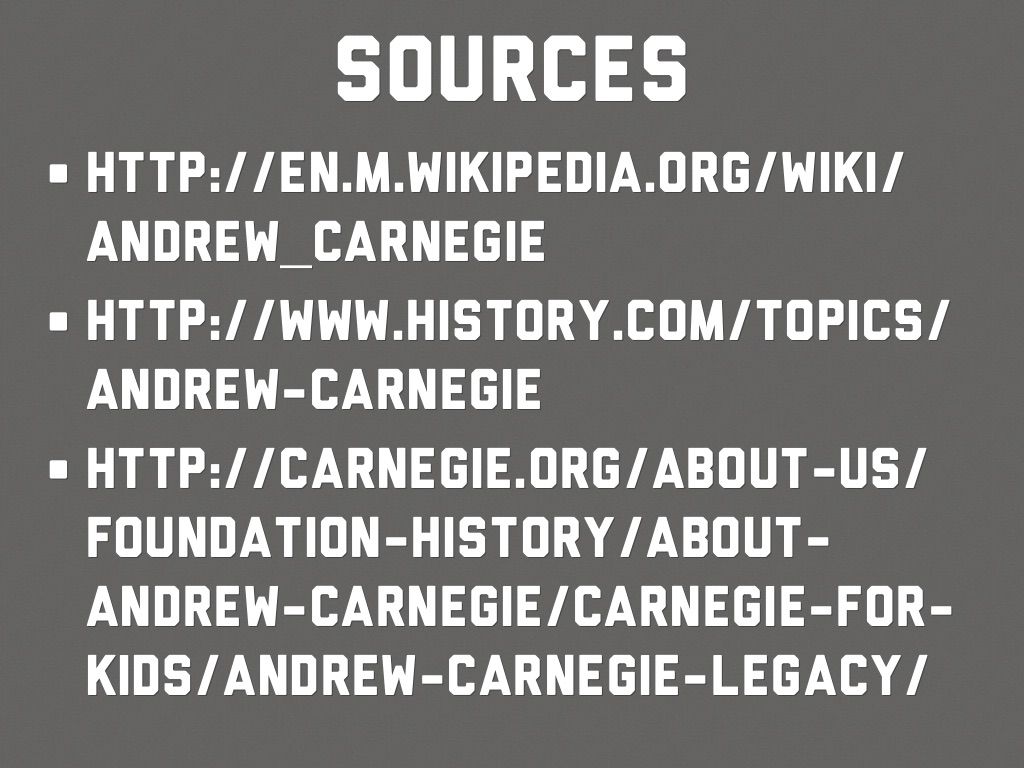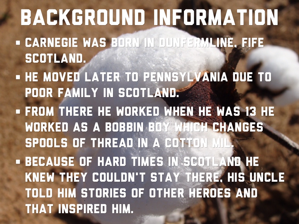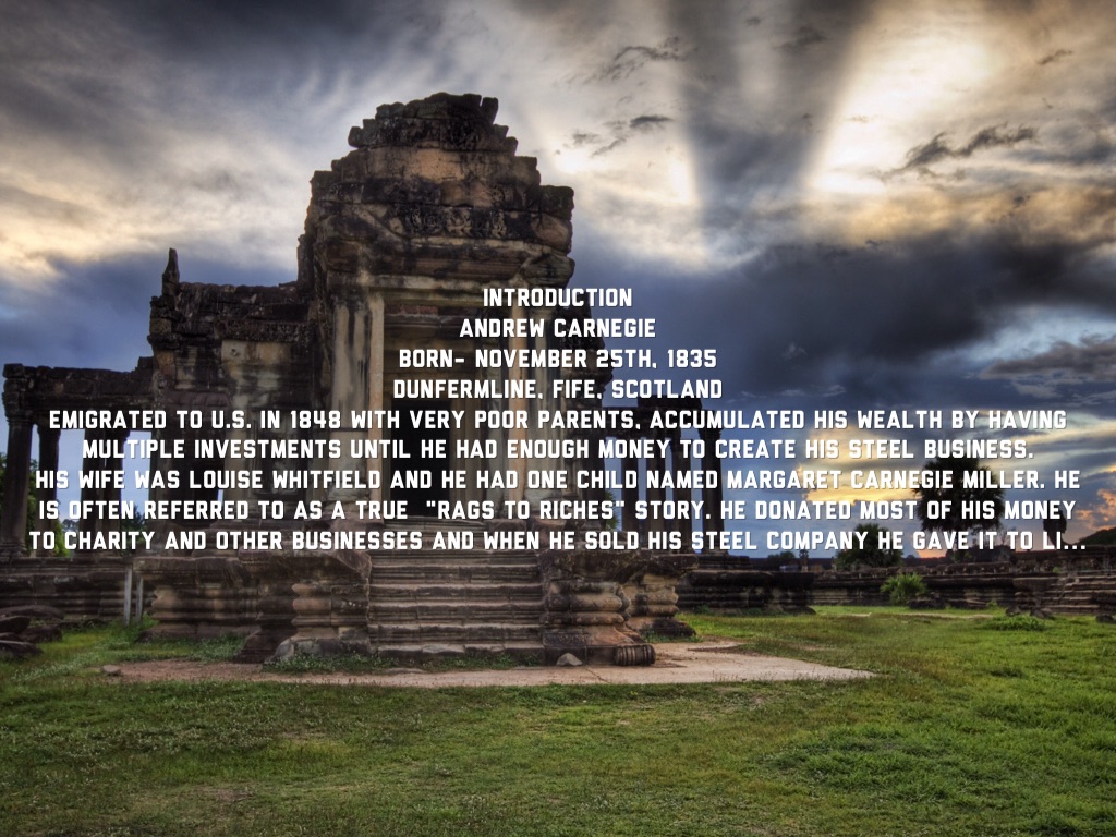 Introduction Andrew Carnegie Born- November 25th, 1835 Dunfermline, fife, Scotland Emigrated to u.s. In 1848 with very poor parents, accumulated his wealth by having multiple investments until he had enough money to create his steel business. His wife was Louise Whitfield and he had one child named Margaret Carnegie miller. He is often referred to as a true "rags to riches" story. He donated most of his money to charity and other businesses and when he sold his steel company he gave it to libraries and other businesses which promoted his name.