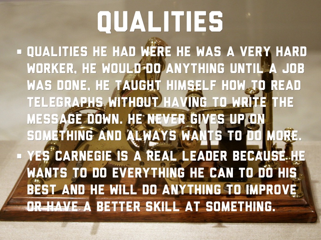 Qualities he had were he was a very hard worker, he would do anything until a job was done, he taught himself how to read telegraphs without having to write the message down. He never gives up on something and always wants to do more.