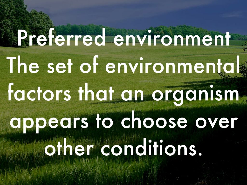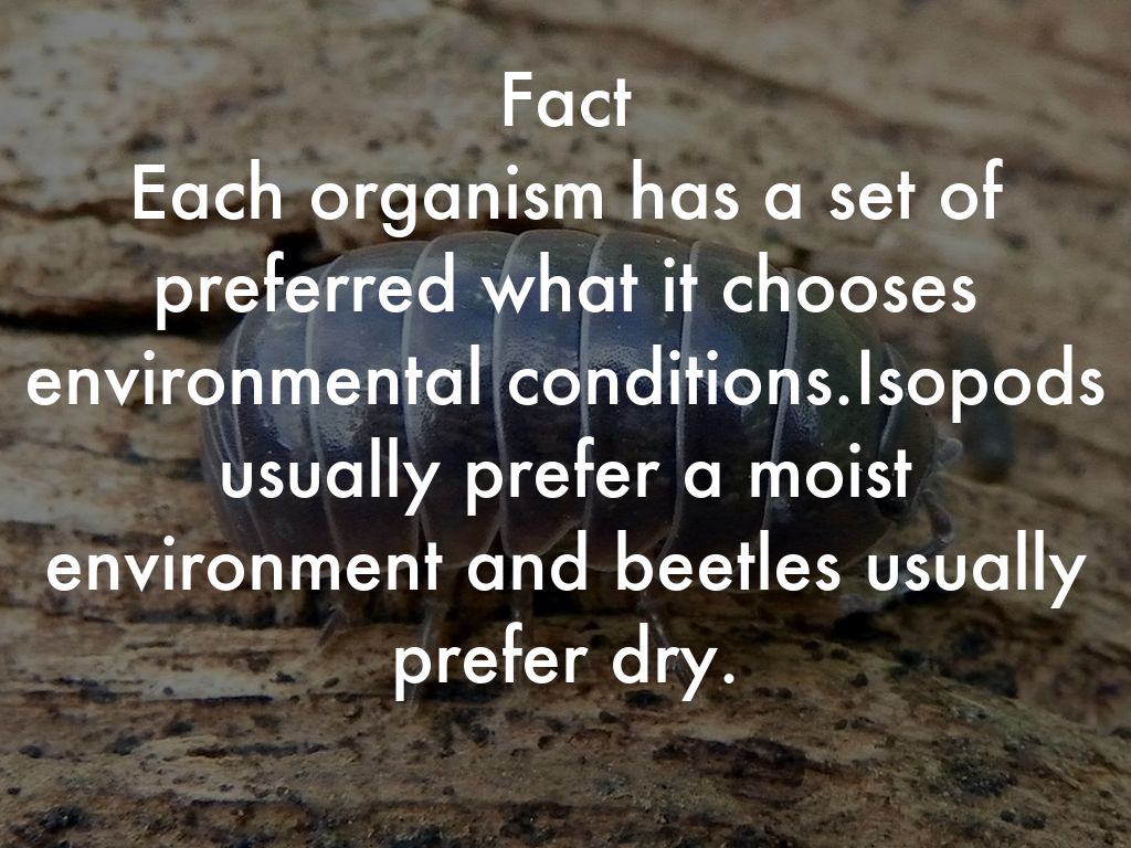 Fact Each organism has a set of preferred what it chooses environmental conditions.Isopods usually prefer a moist environment and beetles usually prefer dry.