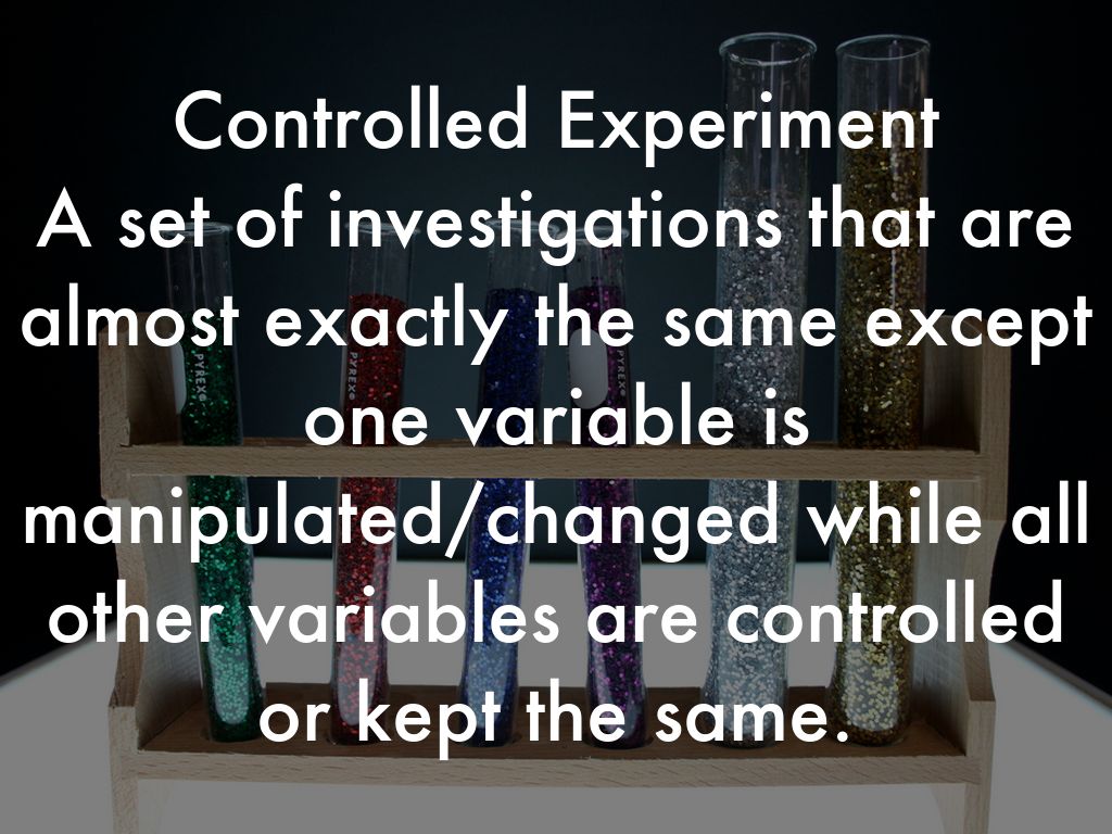 Controlled Experiment A set of investigations that are almost exactly the same except one variable is manipulated/changed while all other variables are controlled or kept the same.