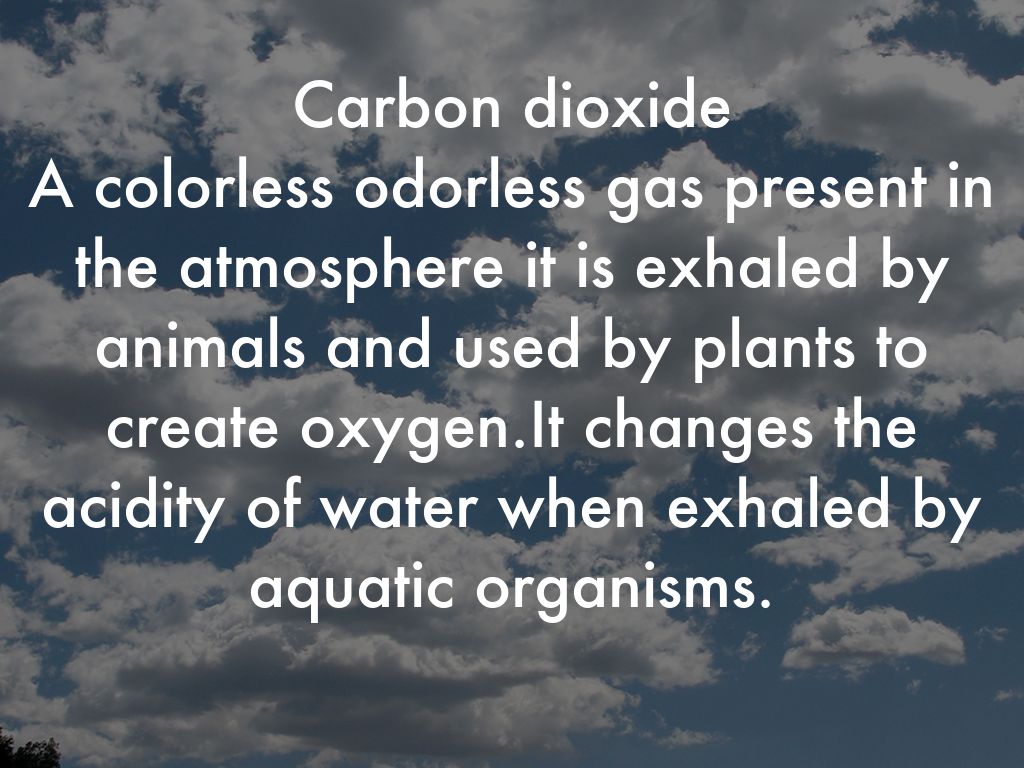 Carbon dioxide A colorless odorless gas present in the atmosphere it is exhaled by animals and used by plants to create oxygen.It changes the acidity of water when exhaled by aquatic organisms.