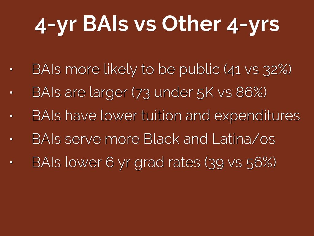 - BAIs lower 6 yr grad rates (39 vs 56%)