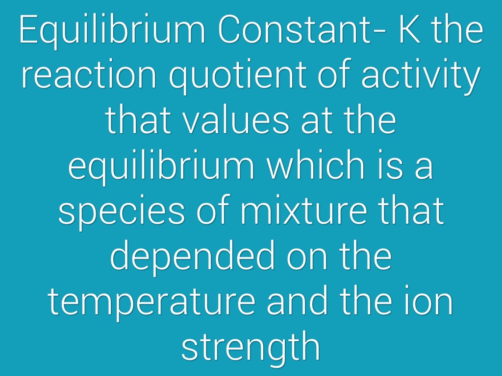 Equilibrium Constant- K the reaction quotient of activity that values at the equilibrium which is a species of mixture that depended on the temperature and the ion strength