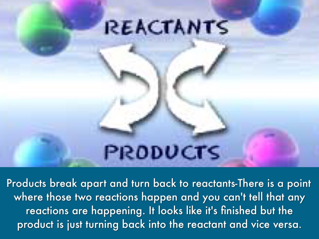 Products break apart and turn back to reactants-There is a point where those two reactions happen and you can't tell that any reactions are happening. It looks like it's finished but the product is just turning back into the reactant and vice versa.