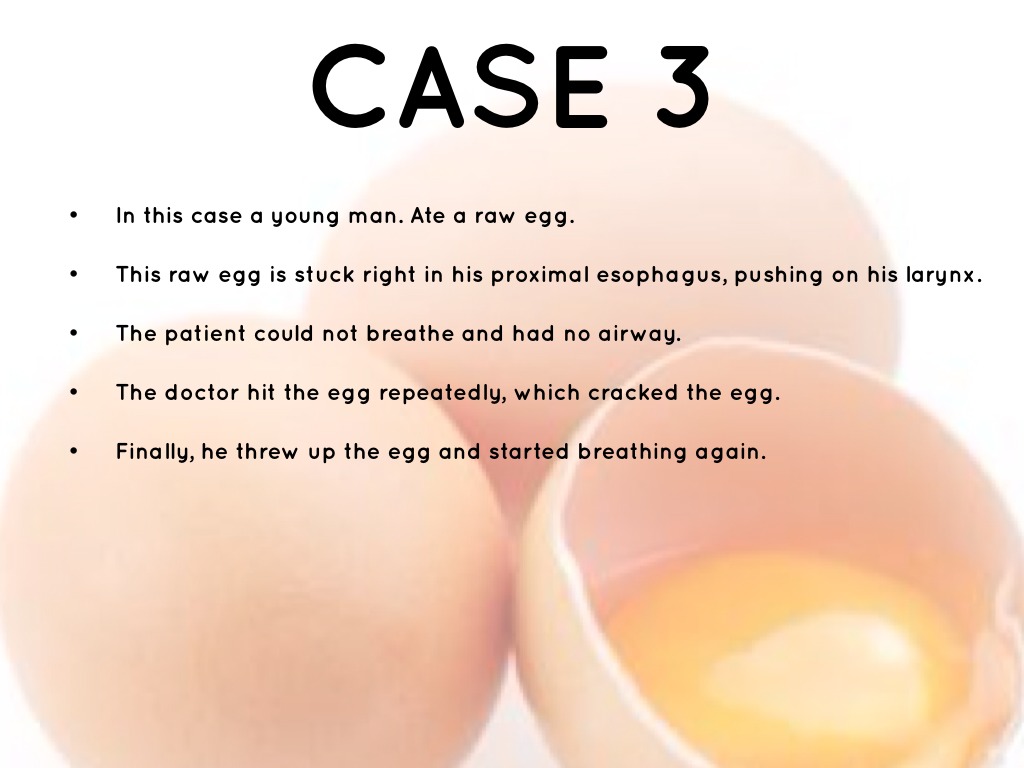 This raw egg is stuck right in his proximal esophagus, pushing on his larynx.