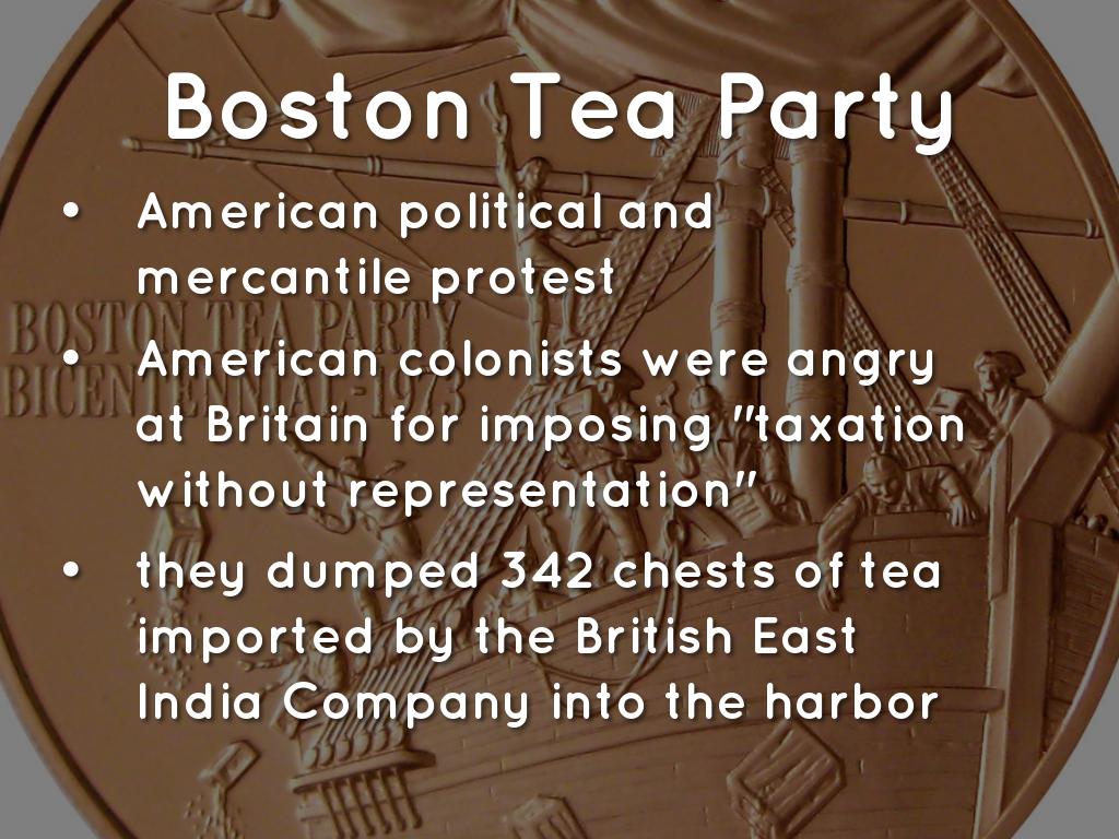 • they dumped 342 chests of tea imported by the British East India Company into the harbor