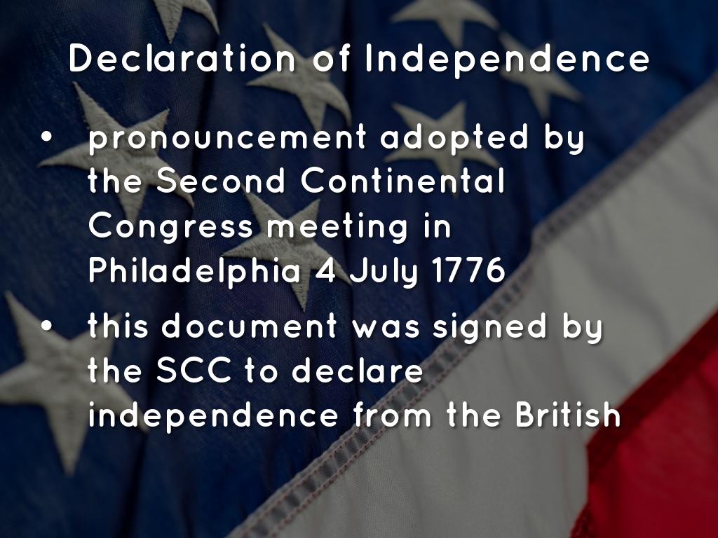 • pronouncement adopted by the Second Continental Congress meeting in Philadelphia 4 July 1776