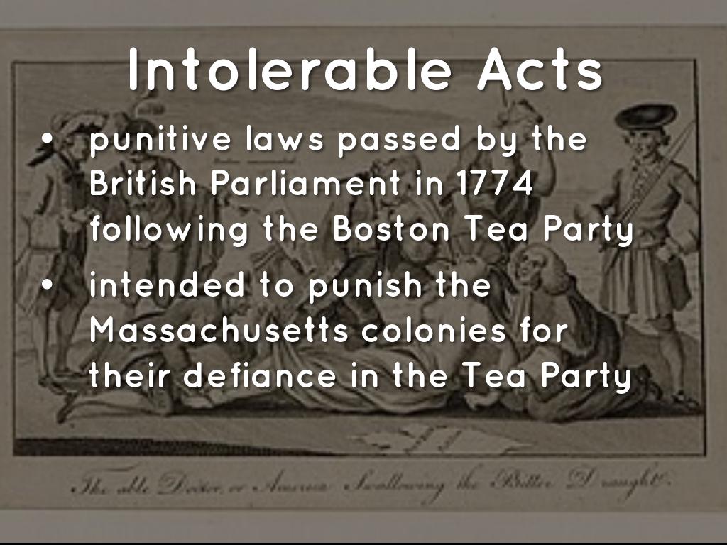 • intended to punish the Massachusetts colonies for their defiance in the Tea Party