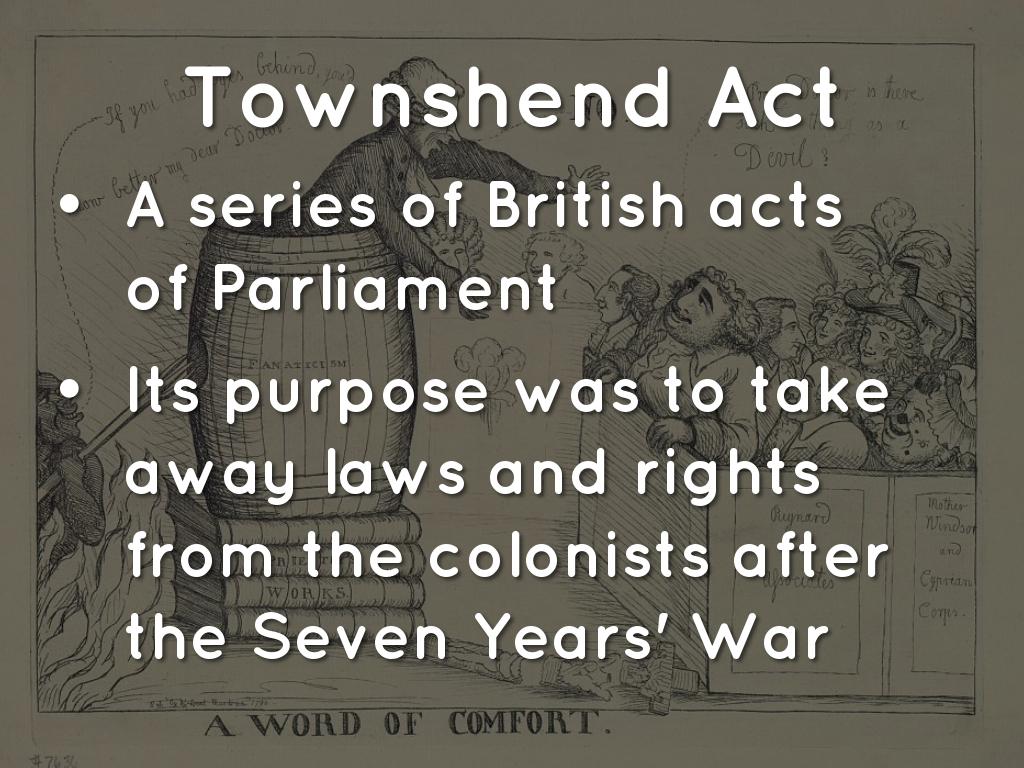 • Its purpose was to take away laws and rights from the colonists after the Seven Years' War