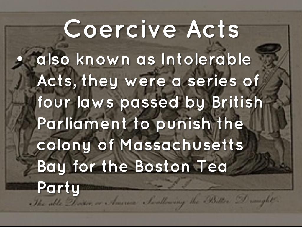 • also known as Intolerable Acts, they were a series of four laws passed by British Parliament to punish the colony of Massachusetts Bay for the Boston Tea Party