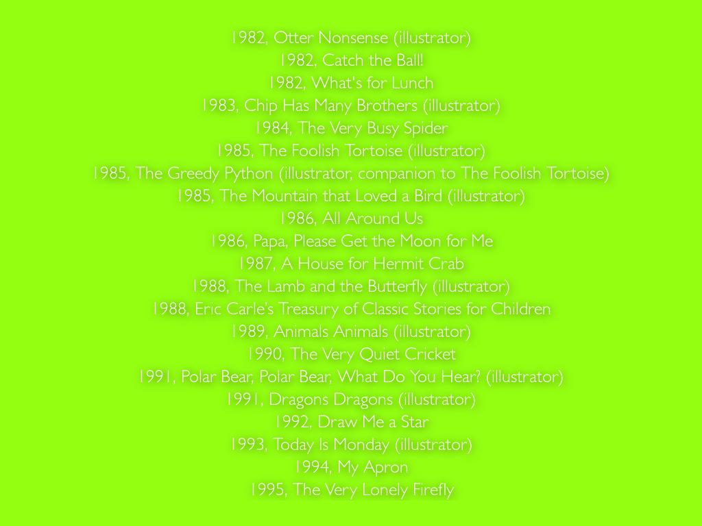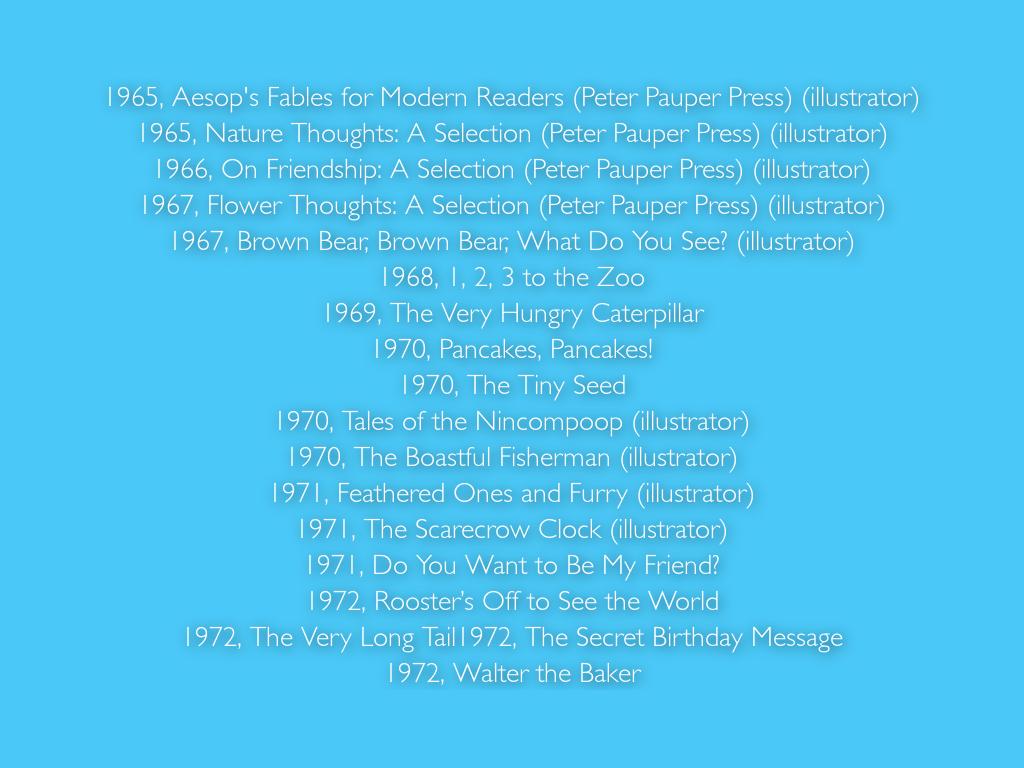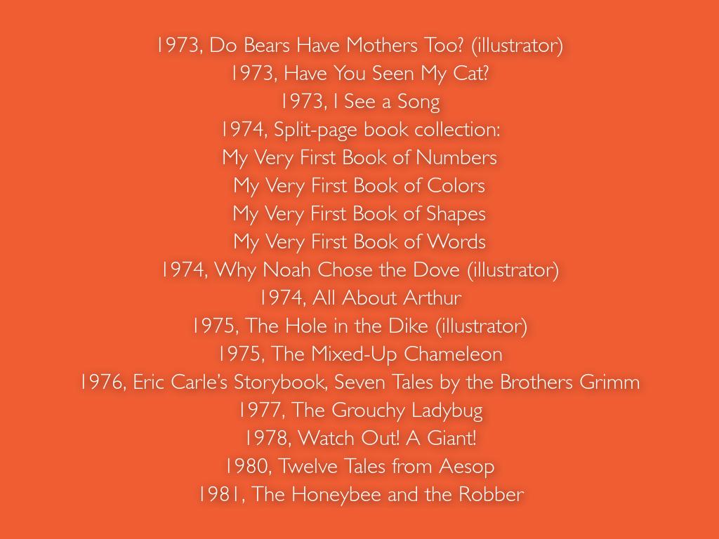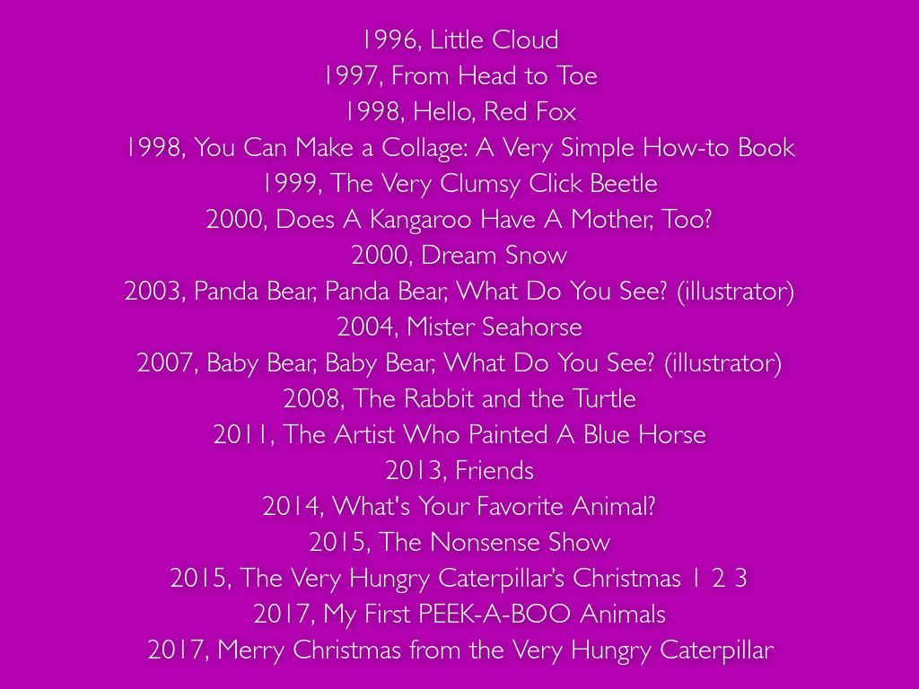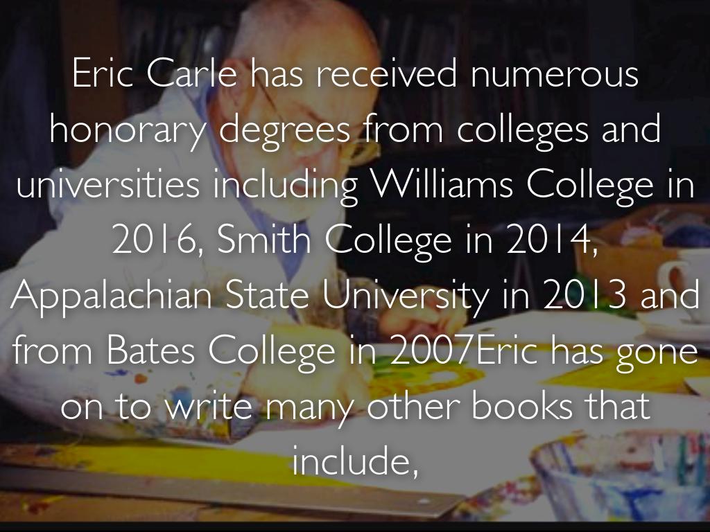 Eric Carle has received numerous honorary degrees from colleges and universities including Williams College in 2016, Smith College in 2014, Appalachian State University in 2013 and from Bates College in 2007Eric has gone on to write many other books that include,