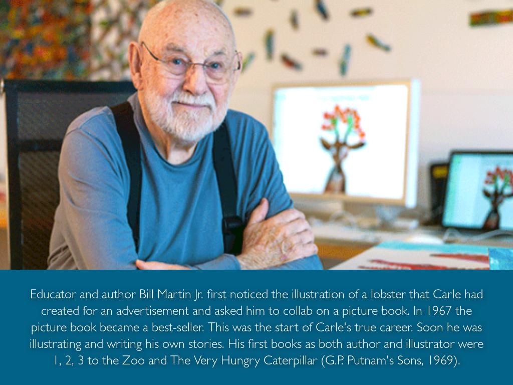 Educator and author Bill Martin Jr. first noticed the illustration of a lobster that Carle had created for an advertisement and asked him to collab on a picture book. In 1967 the picture book became a best-seller. This was the start of Carle's true career. Soon he was illustrating and writing his own stories. His first books as both author and illustrator were 1, 2, 3 to the Zoo and The Very Hungry Caterpillar (G.P. Putnam's Sons, 1969).