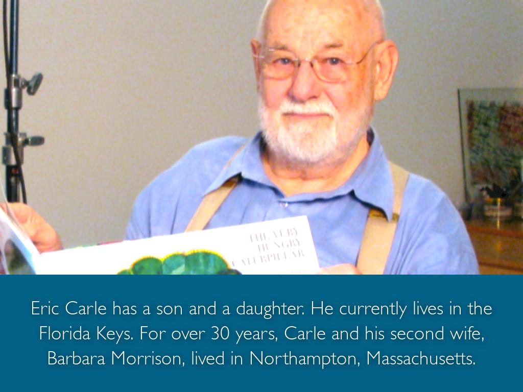 Eric Carle has a son and a daughter. He currently lives in the Florida Keys. For over 30 years, Carle and his second wife, Barbara Morrison, lived in Northampton, Massachusetts.