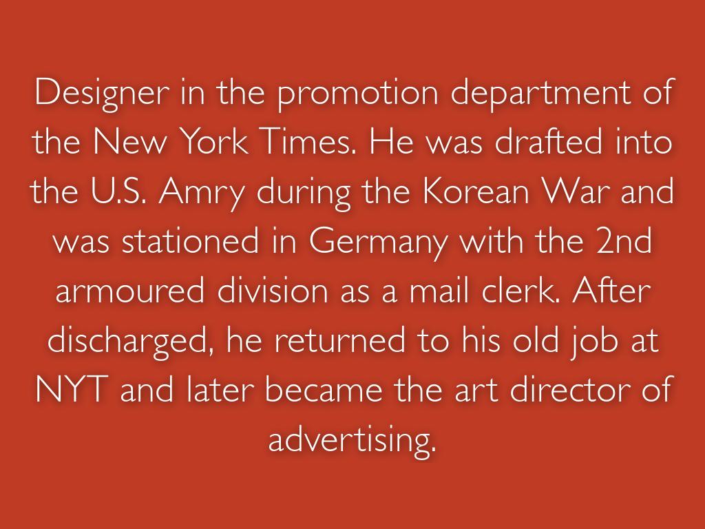 Designer in the promotion department of the New York Times. He was drafted into the U.S. Amry during the Korean War and was stationed in Germany with the 2nd armoured division as a mail clerk. After discharged, he returned to his old job at NYT and later became the art director of advertising.