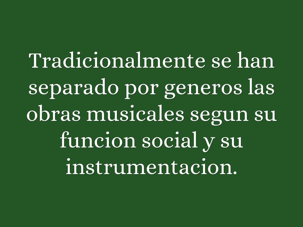 Tradicionalmente se han separado por generos las obras musicales segun su funcion social y su instrumentacion.