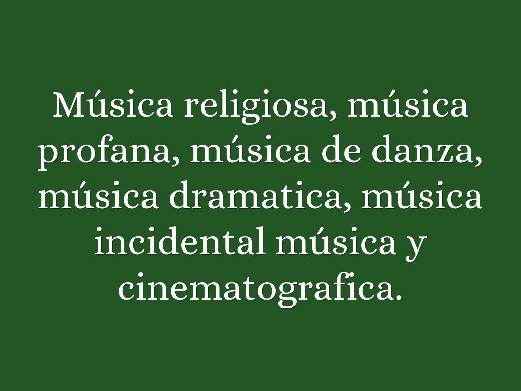 Música religiosa, música profana, música de danza, música dramatica, música incidental música y cinematografica.