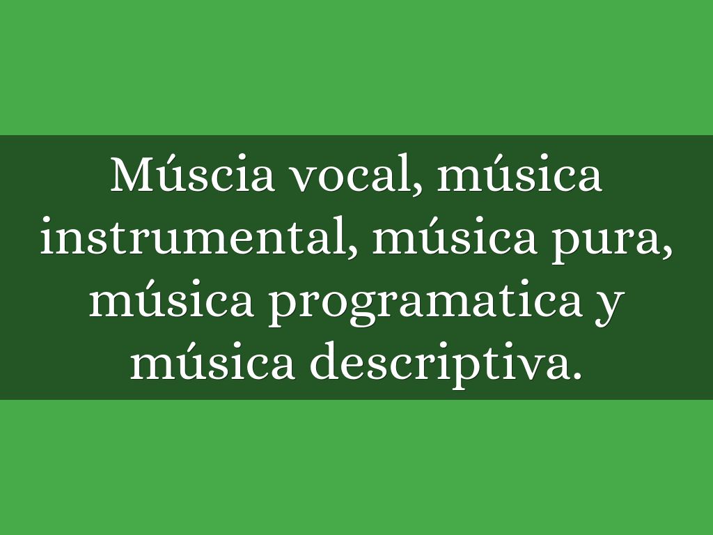 Múscia vocal, música instrumental, música pura, música programatica y música descriptiva.