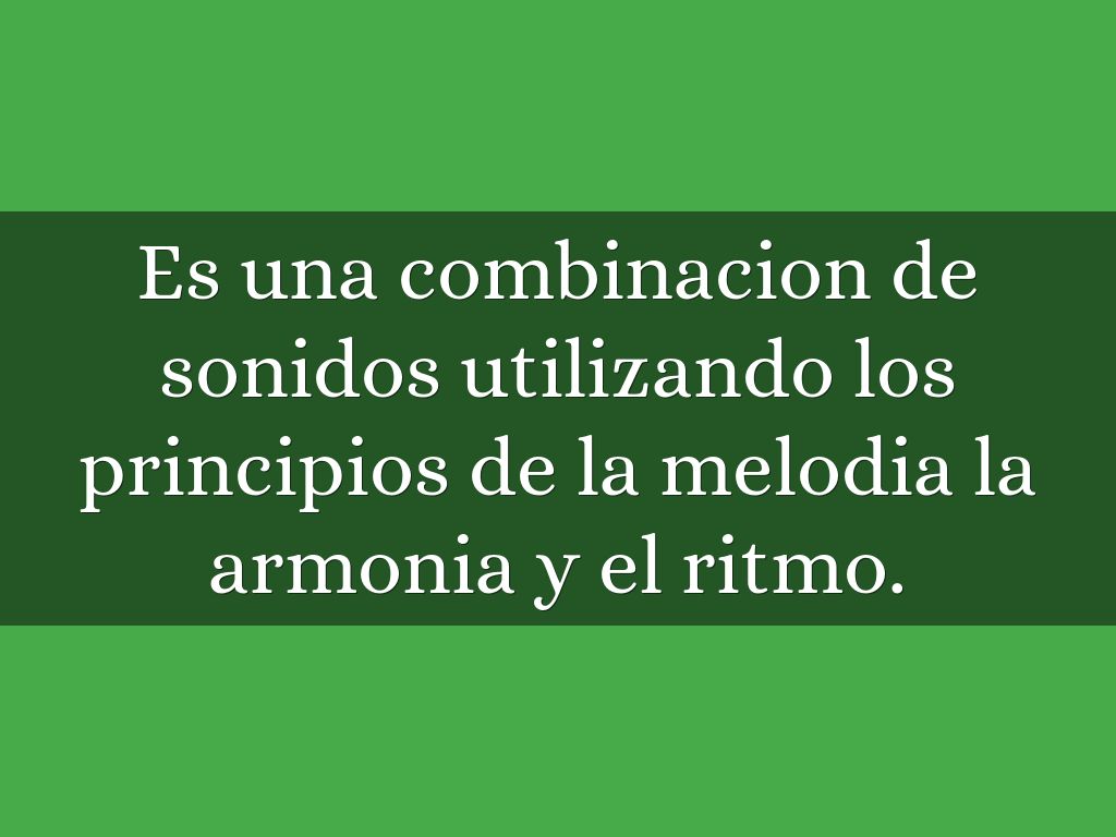 Es una combinacion de sonidos utilizando los principios de la melodia la armonia y el ritmo.