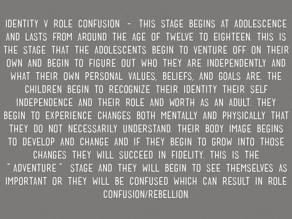 Identity v Role Confusion - This stage begins at adolescence and lasts from around the age of twelve to eighteen. This is the stage that the adolescents begin to venture off on their own and begin to figure out who they are independently and what their own personal values, beliefs, and goals are. The children begin to recognize their identity their self independence and their role and worth as an adult. They begin to experience changes both mentally and physically that they do not necessarily understand. Their body image begins to develop and change and if they begin to grow into those changes they will succeed in fidelity. This is the “adventure” stage and they will begin to see themselves as important or they will be confused which can result in role confusion/rebellion.