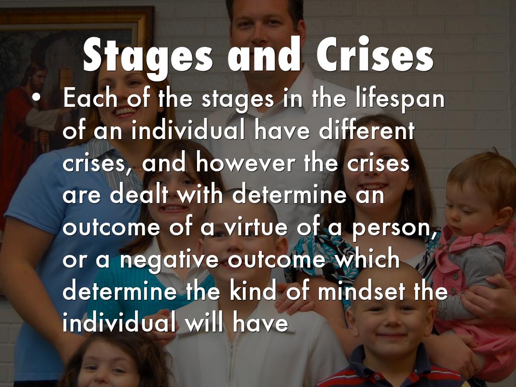 Each of the stages in the lifespan of an individual have different crises, and however the crises are dealt with determine an outcome of a virtue of a person, or a negative outcome which determine the kind of mindset the individual will have