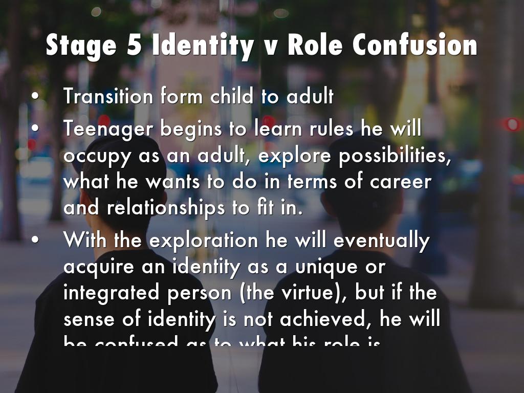 With the exploration he will eventually acquire an identity as a unique or integrated person (the virtue), but if the sense of identity is not achieved, he will be confused as to what his role is creating a negative outcome of rebellion for missing that sense of belonging to any part of society