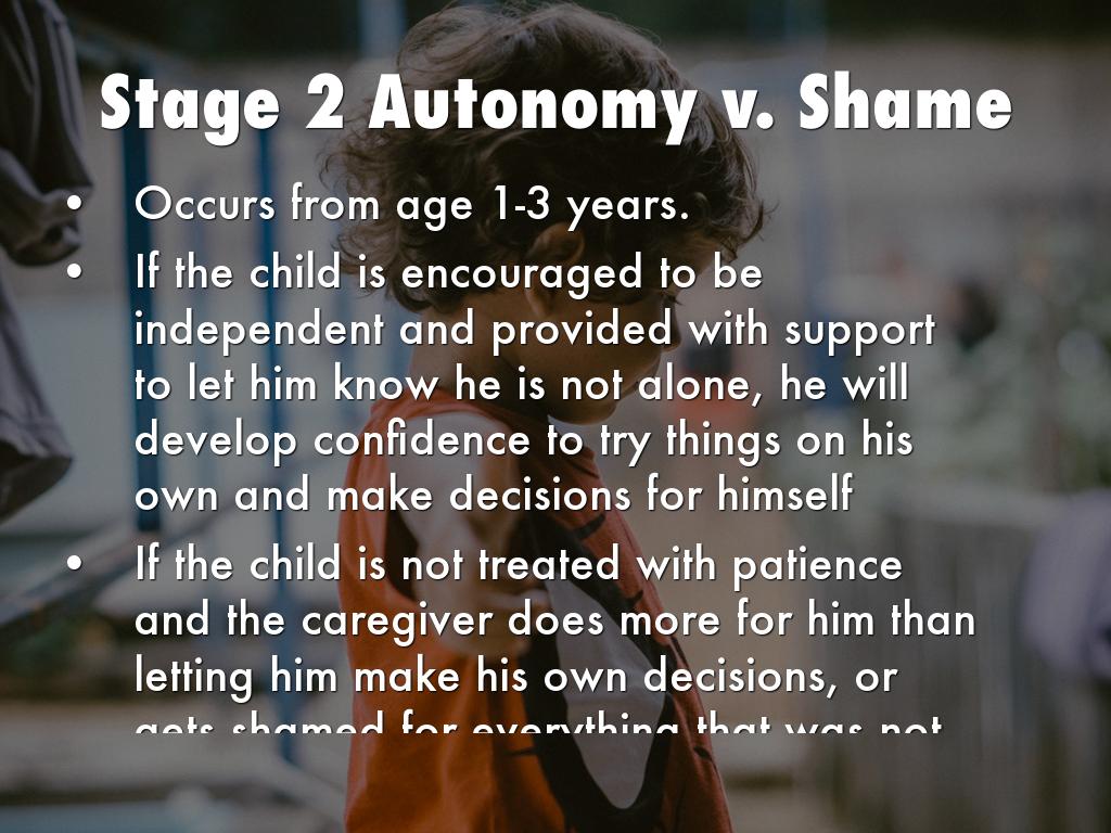 If the child is not treated with patience and the caregiver does more for him than letting him make his own decisions, or gets shamed for everything that was not done right he will be discouraged from trying to do things on his own therefore developing shame or doubt in his abilities.