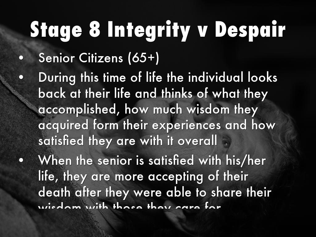During this time of life the individual looks back at their life and thinks of what they accomplished, how much wisdom they acquired form their experiences and how satisfied they are with it overall