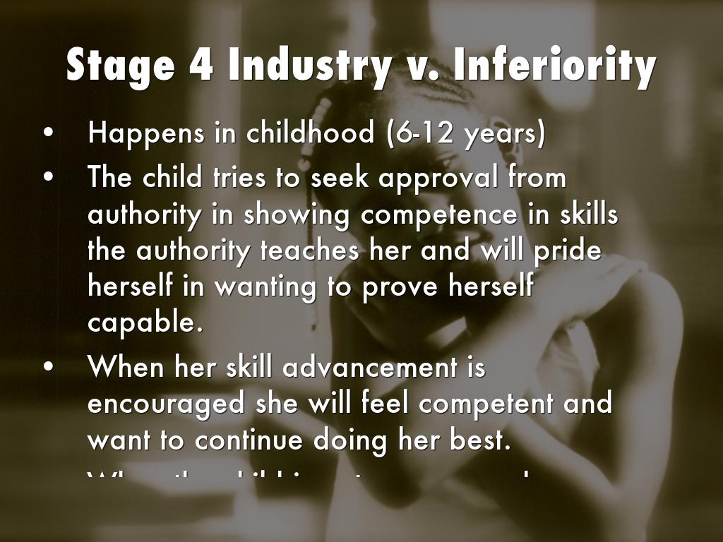 The child tries to seek approval from authority in showing competence in skills the authority teaches her and will pride herself in wanting to prove herself capable.