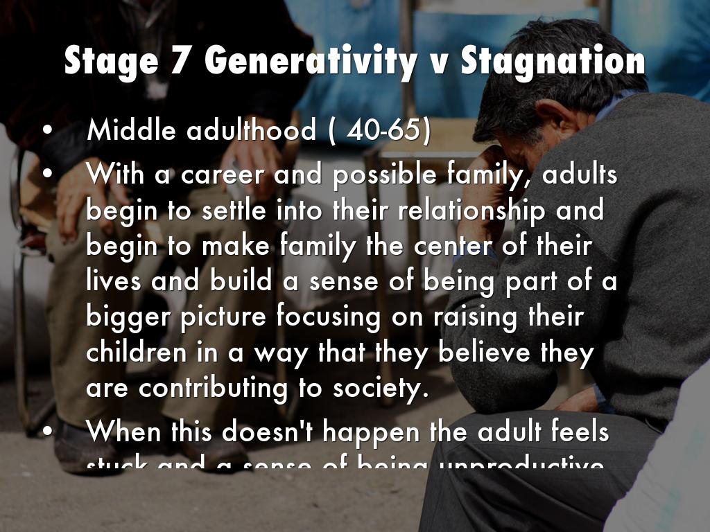 With a career and possible family, adults begin to settle into their relationship and begin to make family the center of their lives and build a sense of being part of a bigger picture focusing on raising their children in a way that they believe they are contributing to society.