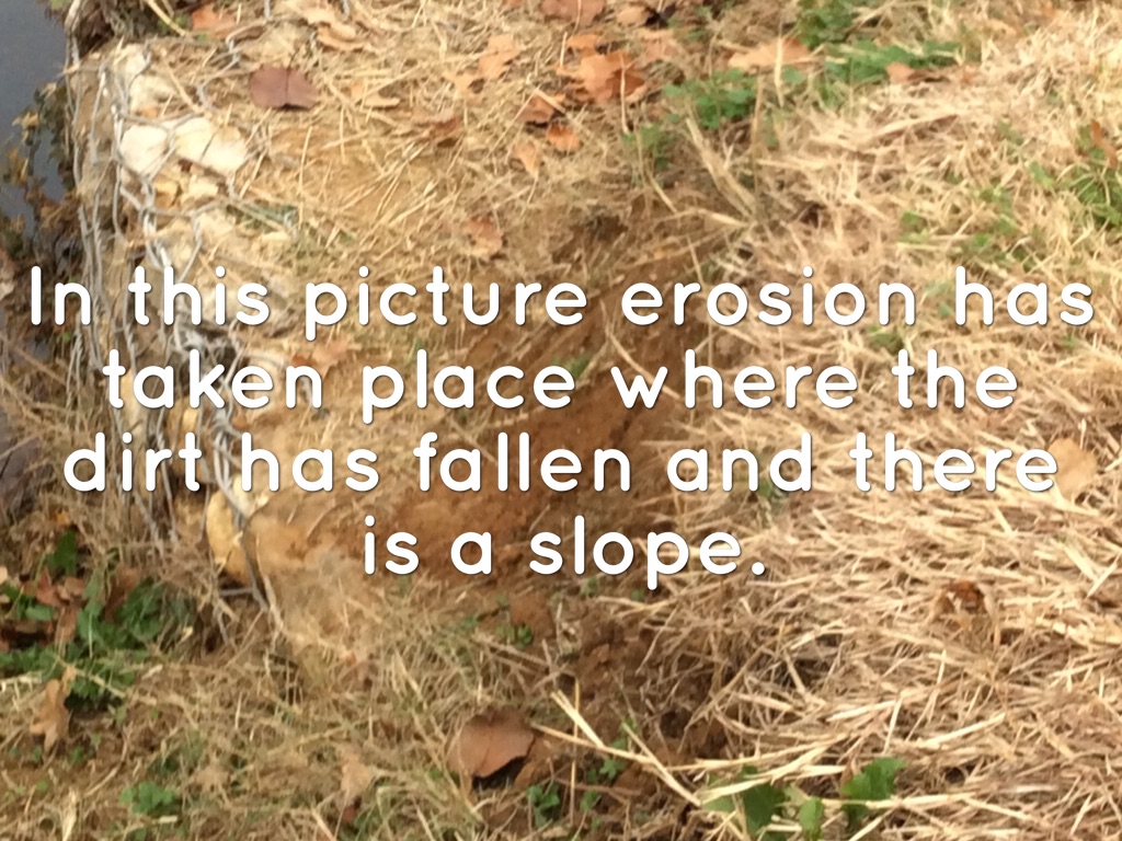 In this picture erosion has taken place where the dirt has fallen and there is a slope.
