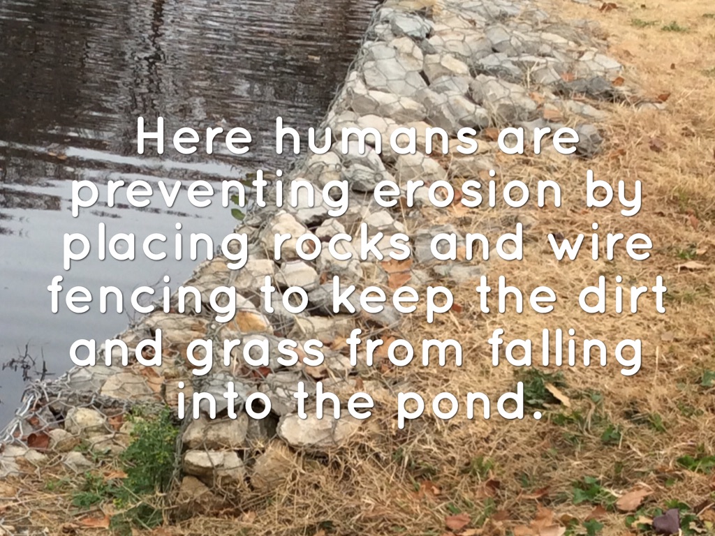 Here humans are preventing erosion by placing rocks and wire fencing to keep the dirt and grass from falling into the pond.