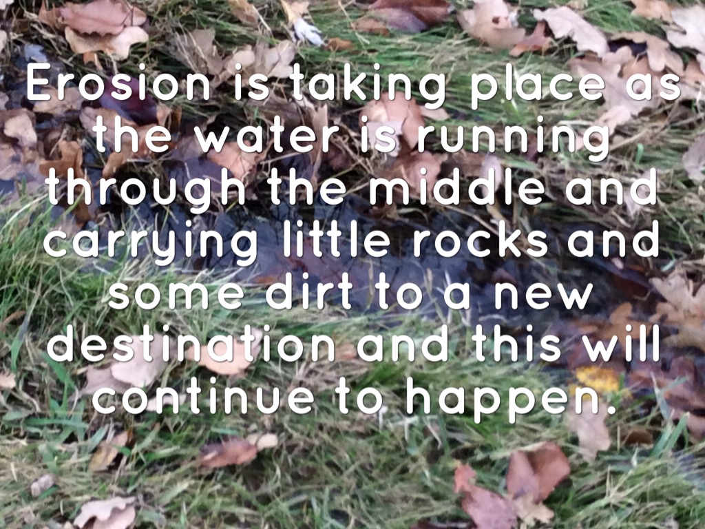Erosion is taking place as the water is running through the middle and carrying little rocks and some dirt to a new destination and this will continue to happen.